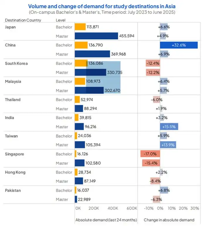 最新研究报告指出,越来越多国际学生将亚洲作为留学目的地,原因包括英语授课项目数量迅速增长、本地大学排名提升、学费与生活成本相对低廉。报告显示,在亚洲目的地中,中国和日本尤为受欢迎。该趋势于 2025 年10月30日公布。