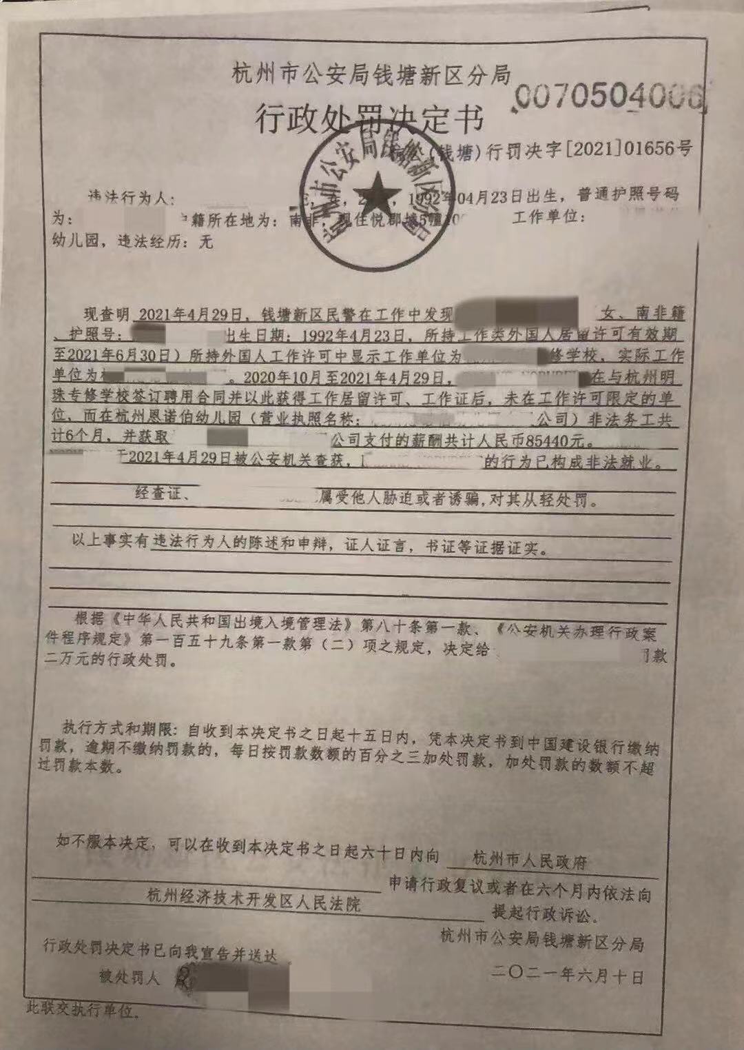A Few weeks ago, a foreign teacher told me that she was fined ¥20,000 by the police and had been unable to find any jobs since then. In the end, the police suggested that she leave China. What caused the whole incident was because her actual work place did not match the work place shown on her work permit (WP) card while working as a Kindergarten teacher.