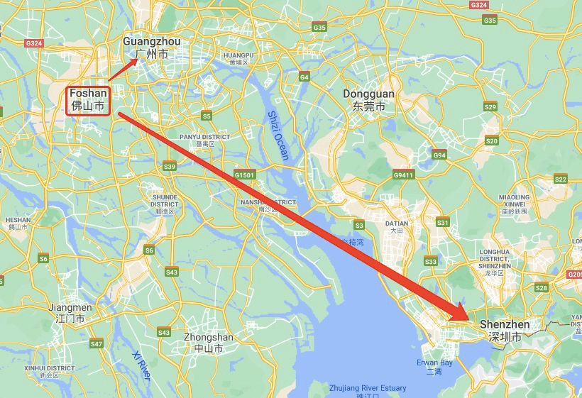 Foshan lies on the Fen River in the estuaries making up the west side of the Pearl RIver Delta. It is 25 km (16 miles) away from Guangzhou, the capitol city of the province of Guangdong. And it is 110 km (68 miles) between Foshan and Shenzhen.